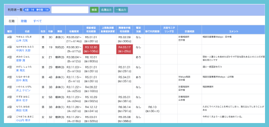 - 利用者の障がいの詳細やサービスの提供情報など細かい情報を一括管理します。受給者証の有効期限や障がい者手帳の更新や期限がわかる様にアラート機能も搭載しておりますので、期限切れなどの見落としも防げます。
