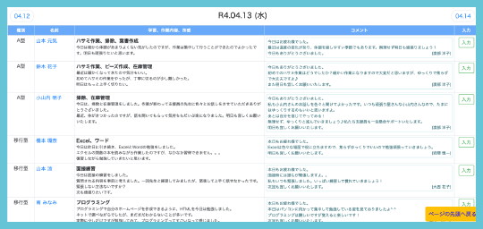 - 利用者様が自身のマイページにログインし、日々の作業内容や所感等を日報に入力します。利用者様の日報記録は管理画面に連動しており、日報に対してはスタッフがコメントできるので、利用者様との円滑なコミュニケーションが可能となります。