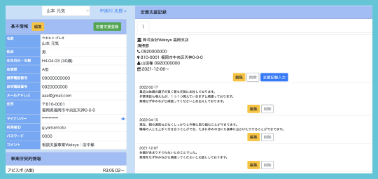 - 日々の支援記録も一括で管理することができます。スタッフ名、記入時間、支援内容も簡単に入力できます。また、ワンクリックで出力も可能です。