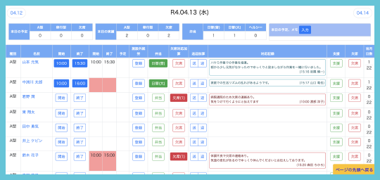 - 日々の利用者の勤怠管理、欠席対応、支援記録など管理することができます。利用者、スタッフ側の両方で管理を行うことで勤怠の不備や間違いを未然に防ぐこともできます。