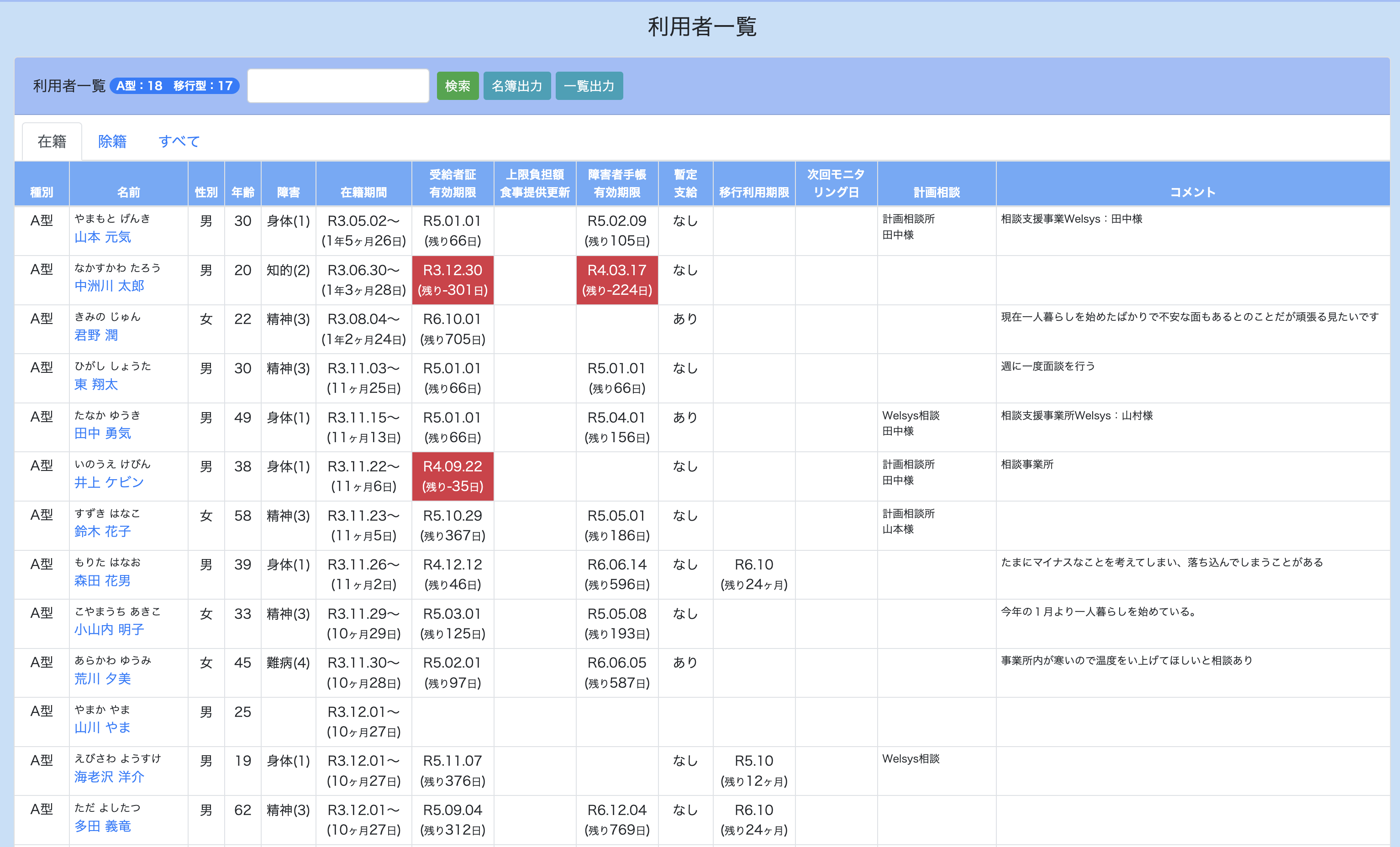- 利用者の障がいの詳細やサービスの提供情報など細かい情報を一括管理します。受給者証の有効期限や障がい者手帳の更新や期限がわかる様にアラート機能も搭載しておりますので、期限切れなどの見落としも防げます。