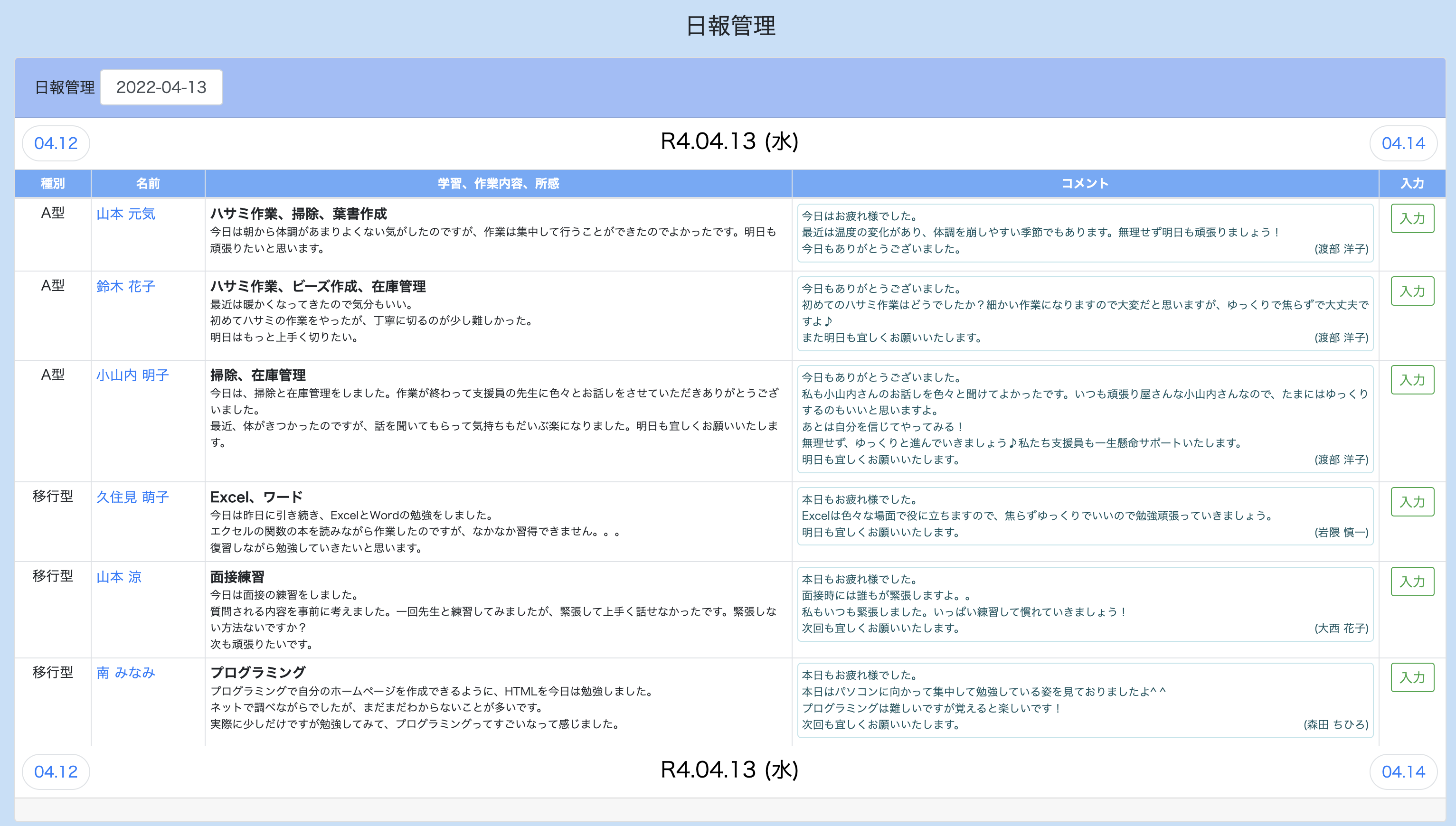 - 利用者様が自身のマイページにログインし、日々の作業内容や所感等を日報に入力します。利用者様の日報記録は管理画面に連動しており、日報に対してはスタッフがコメントできるので、利用者様との円滑なコミュニケーションが可能となります。