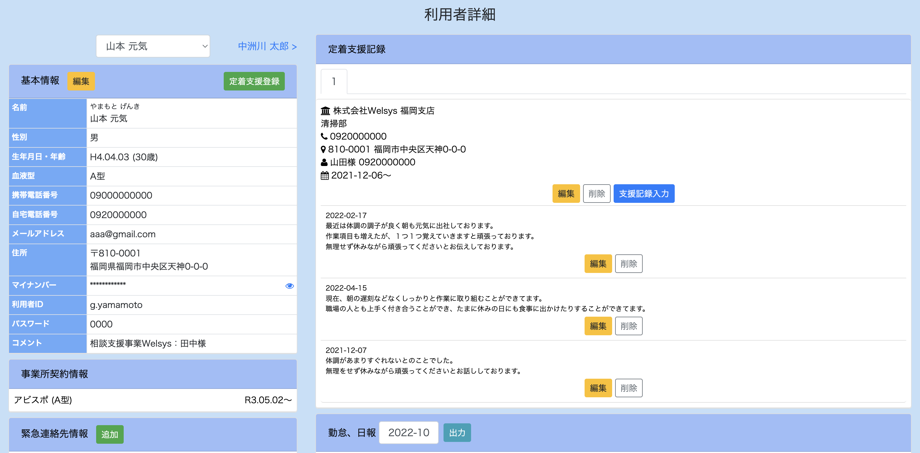 - 日々の支援記録も一括で管理することができます。スタッフ名、記入時間、支援内容も簡単に入力できます。また、ワンクリックで出力も可能です。