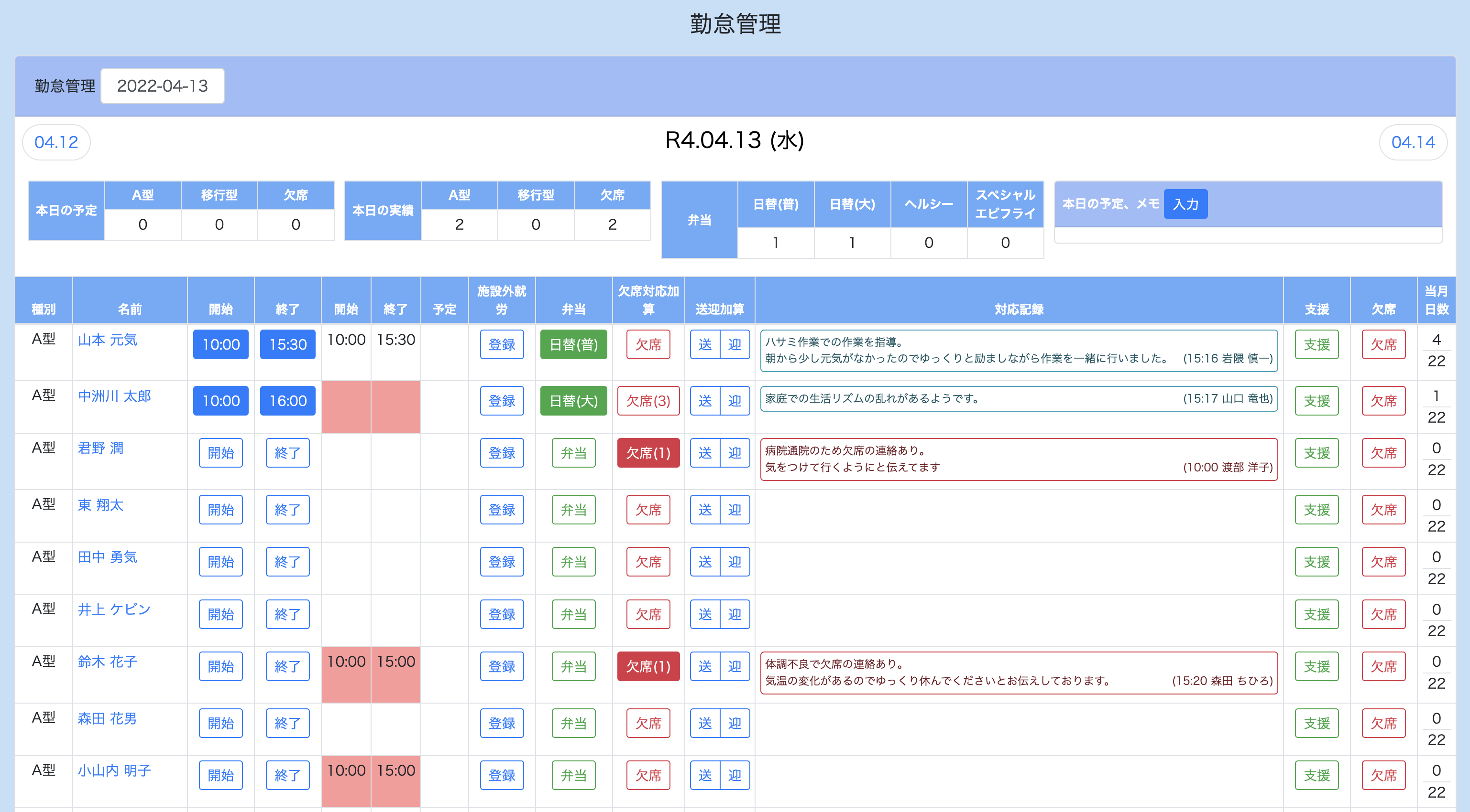 - 日々の利用者の勤怠管理、欠席対応、支援記録など管理することができます。利用者、スタッフ側の両方で管理を行うことで勤怠の不備や間違いを未然に防ぐこともできます。